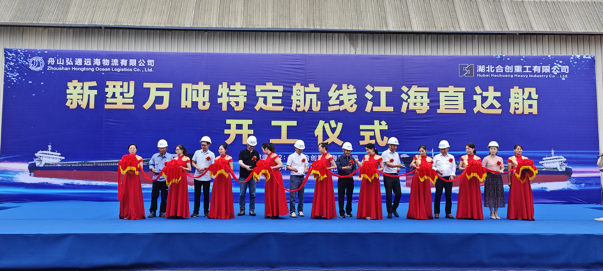 湖北合創(chuàng)重工舉行舟山弘通遠海物流新型萬噸特定航線江海直達船船建造開工點火啟動儀式。舟山市港航和口岸管理局、舟山通航運發(fā)展有限公司、湖北合創(chuàng)重工有限公司等主、承、協(xié)辦單位領導、各工程項目單位代表、部門成員共計50余人參加儀式。